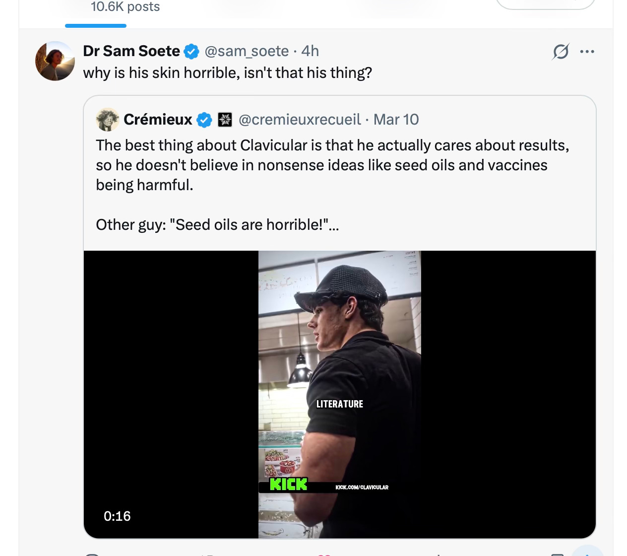 In clav’s case, he now has terrible skin health. This is a direct consequence of the multitude of compounds he’s mixing together.