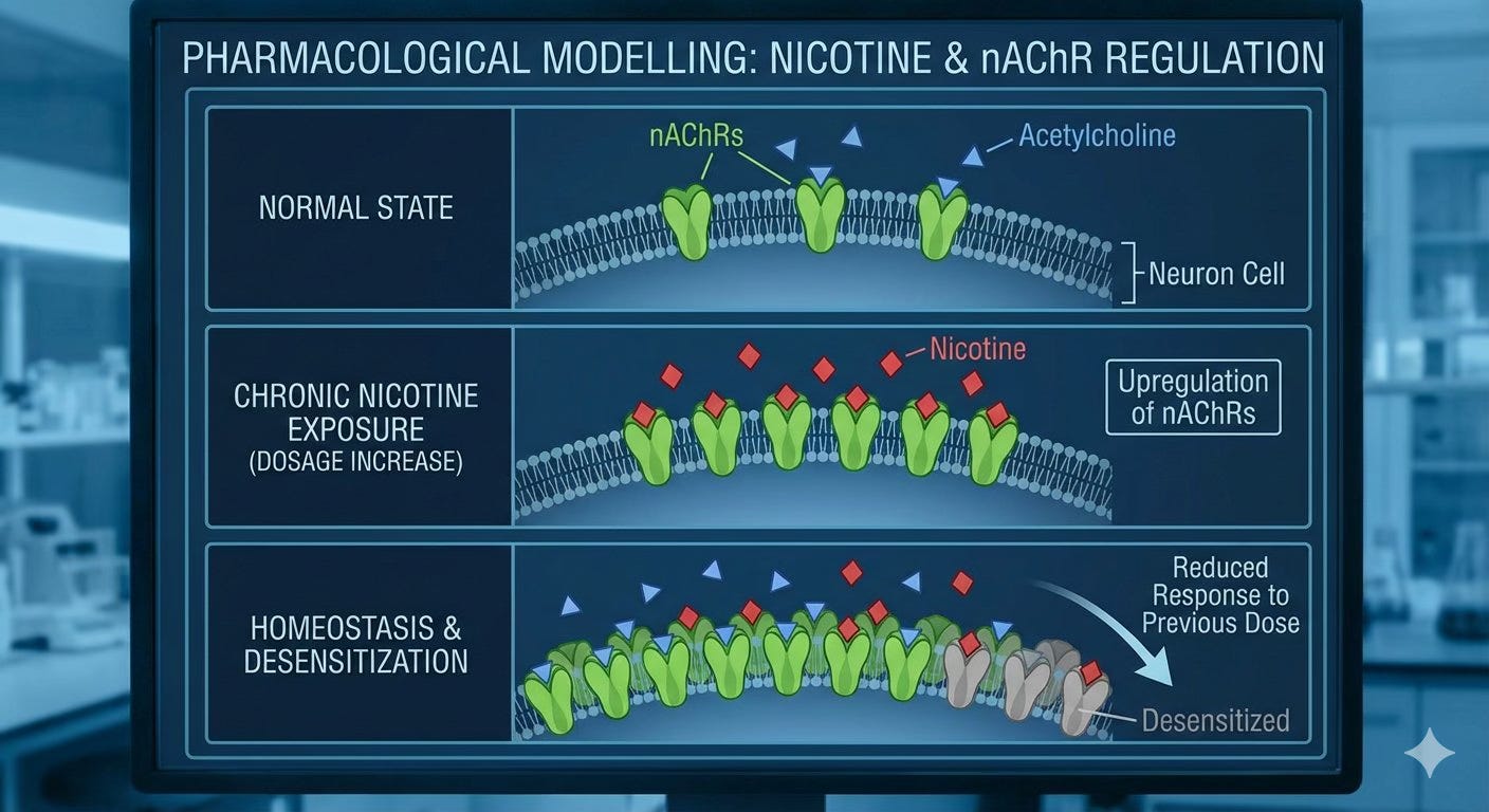 But that first layer of clarity hides the deeper mechanism underneath. Nicotine doesn’t just activate those receptors